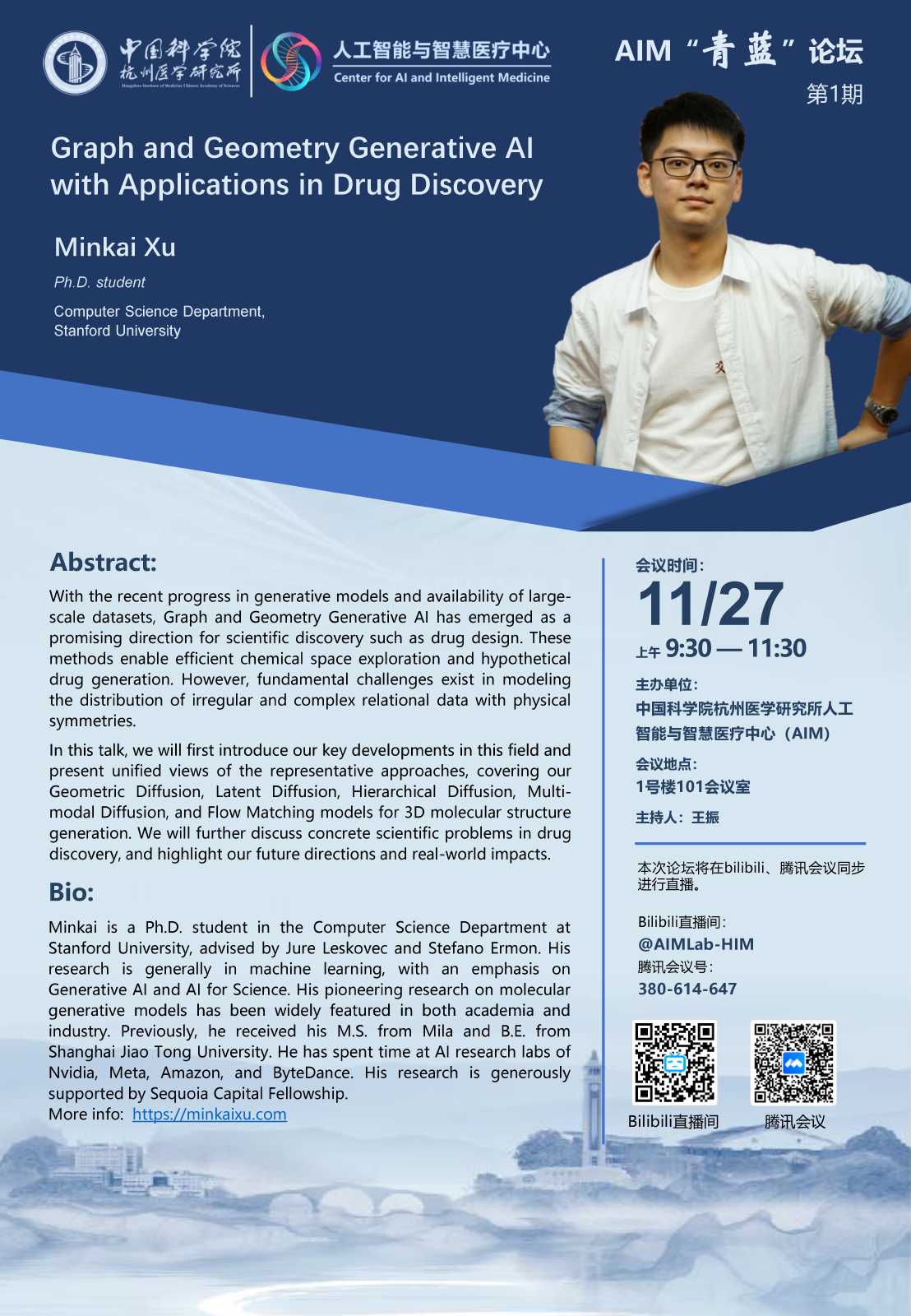 本期论坛非常荣幸邀请到斯坦福大学的徐民凯(PhD student),为我们带来《Graph and Geometry Generative AI with Applications in Drug Discovery》的报告!