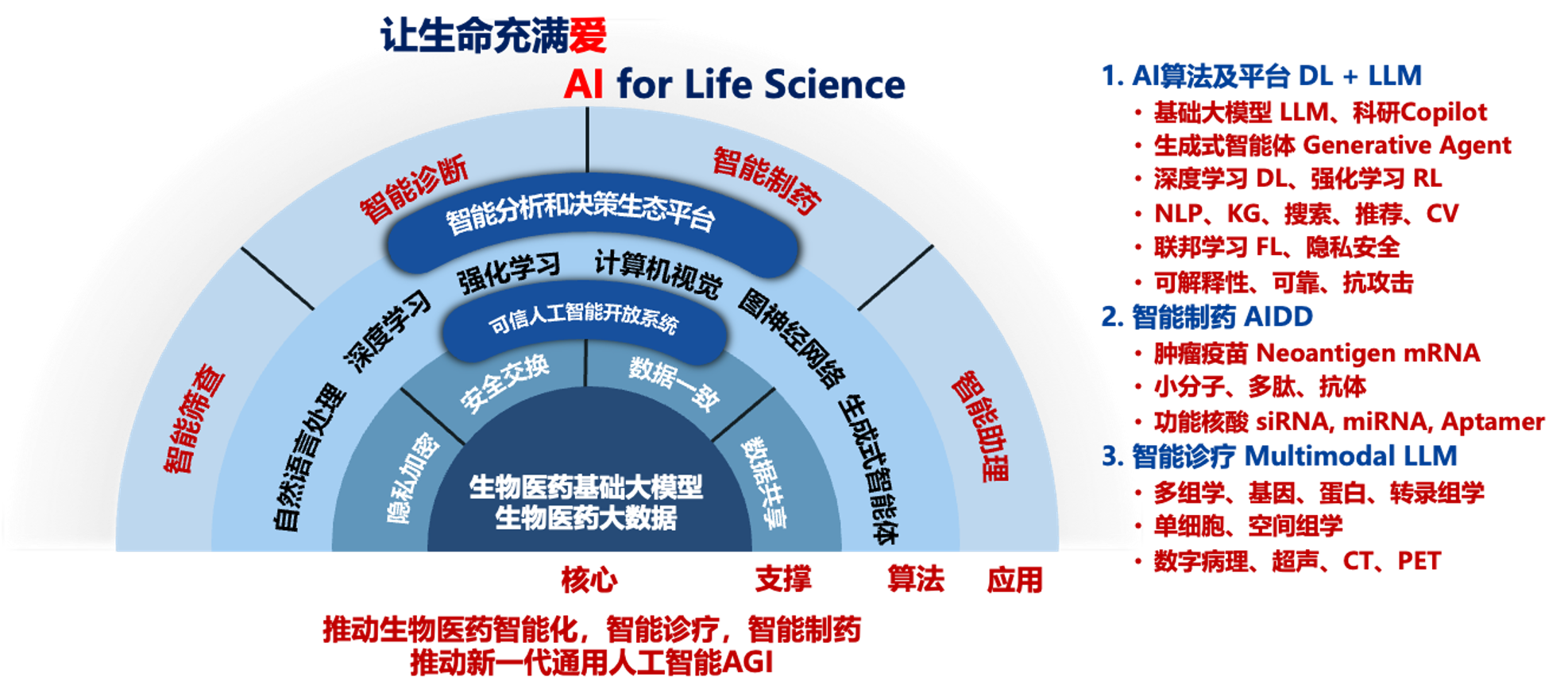 We explore and apply cutting-edge artificial intelligence algorithms and trustworthy AI platform technologies. Our mission is to build foundational models and platforms – including Large Language Models (LLMs), Multimodal Generative AI, and Generative Agents – and to securely integrate distributed, large-scale biomedical data from multiple sources. This work establishes a trustworthy AI infrastructure for smart healthcare, fostering a next-generation ecosystem of foundational models and intelligent science. Our current key focus areas include foundational models, deep learning, reinforcement learning, Natural Language Processing (NLP), Computer Vision (CV), Knowledge Graphs (KG), search, recommendation systems, federated learning, large-scale deep learning cloud-native platforms, and a trustworthy AI operating system.